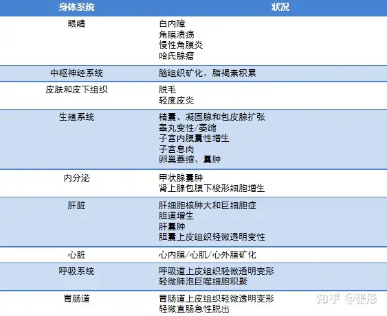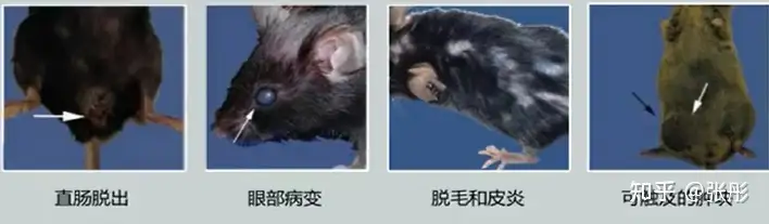 同时随着年龄增长,与年龄相关的各项疾病也随之而来,产生一些和疾病相关的表型。例如:自发肿瘤、眼周病变、皮炎脱毛等。