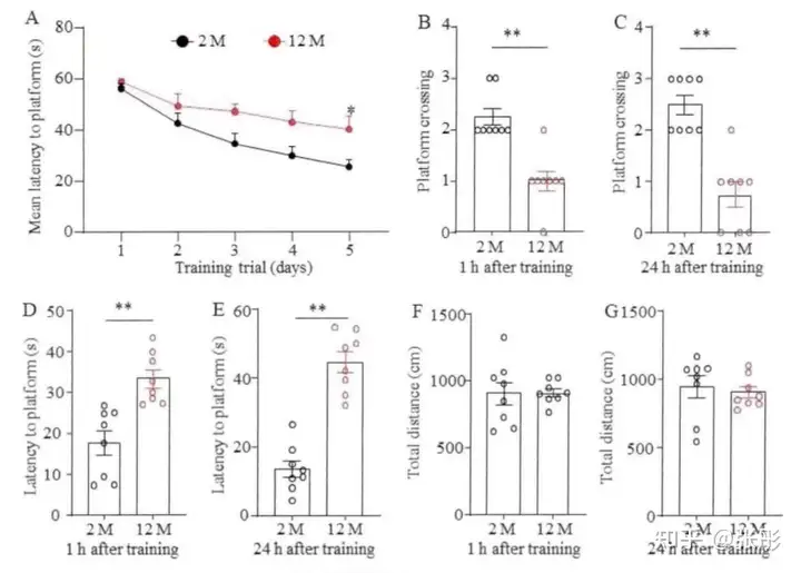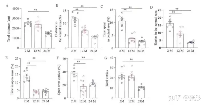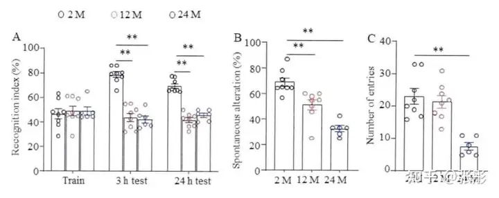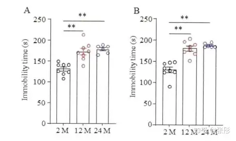 实验表明对比2月龄、12月龄小鼠和24月龄小鼠的识别记忆、工作记忆和空间记忆都出现了不同程度的损伤。在强迫游泳实验和悬尾实验中,老年小鼠不动时间显著延长,这表明老年小鼠出现了抑郁样行为。旷场实验和高架十字迷宫实验都表明老年小鼠出现了明显焦虑样行为。