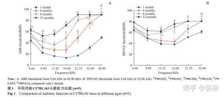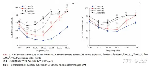 在老年时听力(听觉)随年龄增加也逐渐下降,原因主要是由于Ahl基因缺失,表现为内层和外层毛细胞紊乱。因此,听阈(auditory-evokedbrainstem response,ABR)较高,不容易引起听源性惊厥。