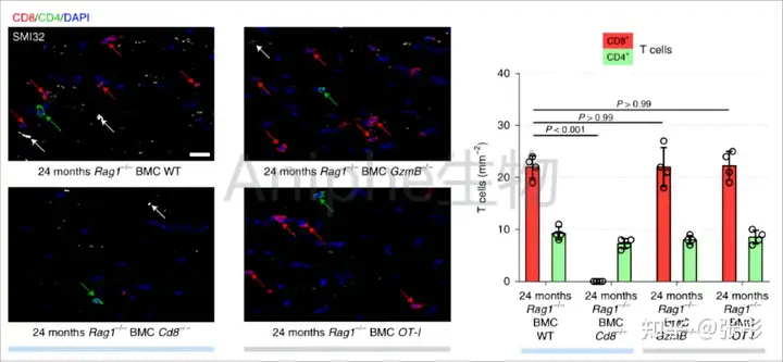 在老龄化的大脑组织中有明显增加的CD8+T细胞,CD8+T细胞会随衰老积累,损伤神经,导致认知和运动能力衰退。当CD8+T细胞数量减少、无法被激活或表达细胞毒性效应分子减少的时候,变老给大脑带来的损伤都明显地减小,衰老带来的运动能力减弱也有一定的恢复。